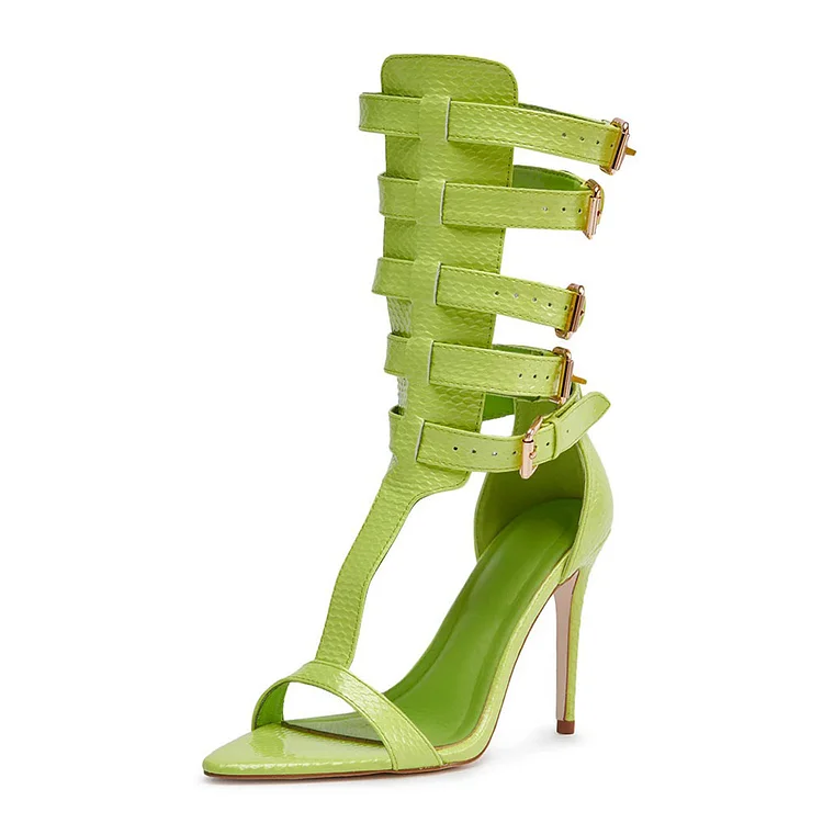 Elevate your style with these Light Green Snakeskin Gladiator Shoes. Featuring stiletto heels and chic buckle straps, these shoes are perfect for making a statement with every step you take.