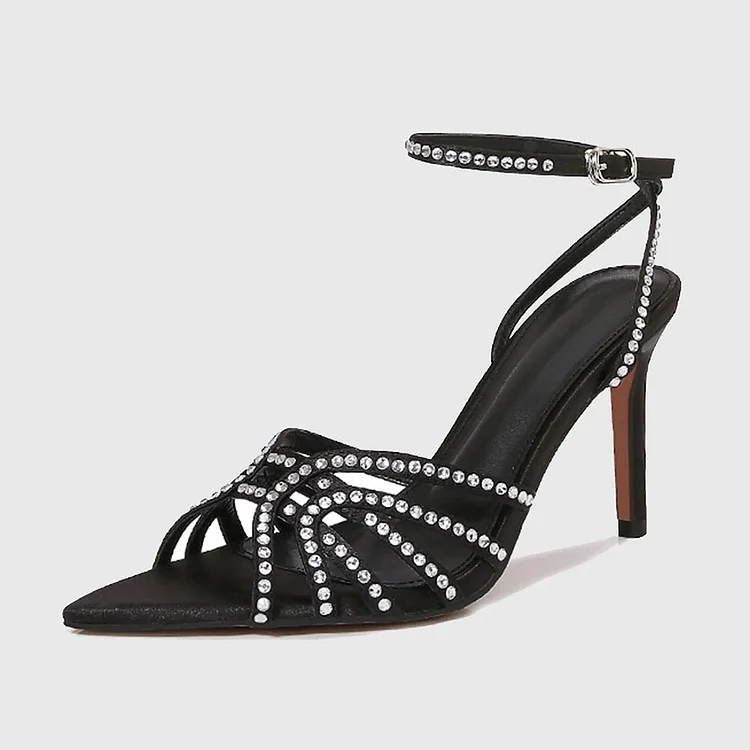 Elevate your style with these Black Open Toe Stiletto Heel Rhinestone Ankle Strap Sandals. Sparkling rhinestones adorn the straps, adding glamour to any outfit. Perfect for special occasions!