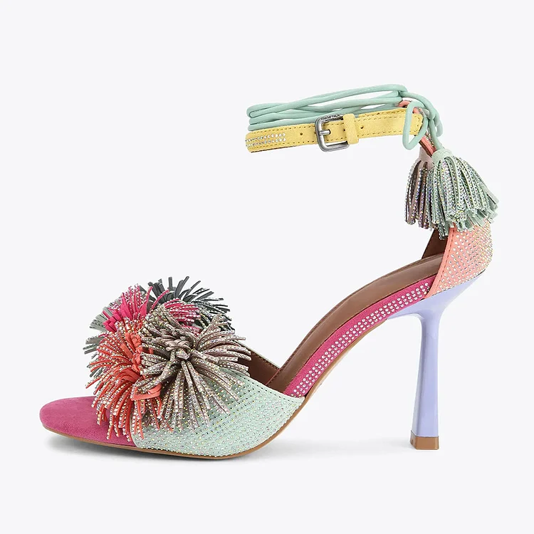 Colorful Stiletto Heel Pom Poms Lace-Up Tassels Rhinestone Sandals