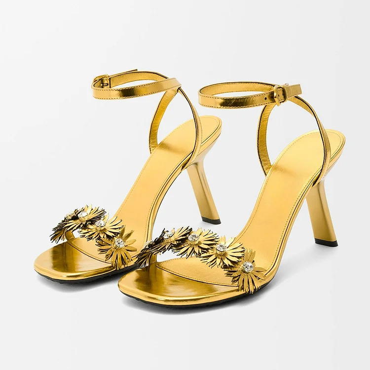 Gold Flower Open Toe Ankle Strap Rhinestone Women's Heel Sandals