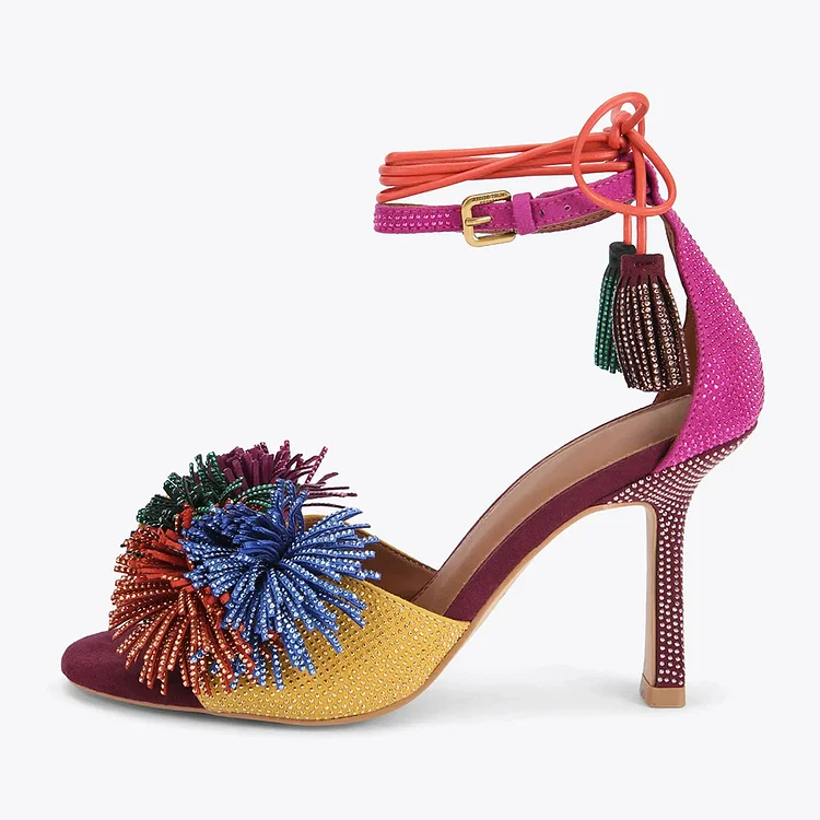 Step into glamour with our Multicolor Rhinestone Ankle Strap Open Toe Pom Poms High Heels Sandals. Adorned with dazzling rhinestones, playful pom poms, and a chic ankle strap, these elevate your style effortlessly.