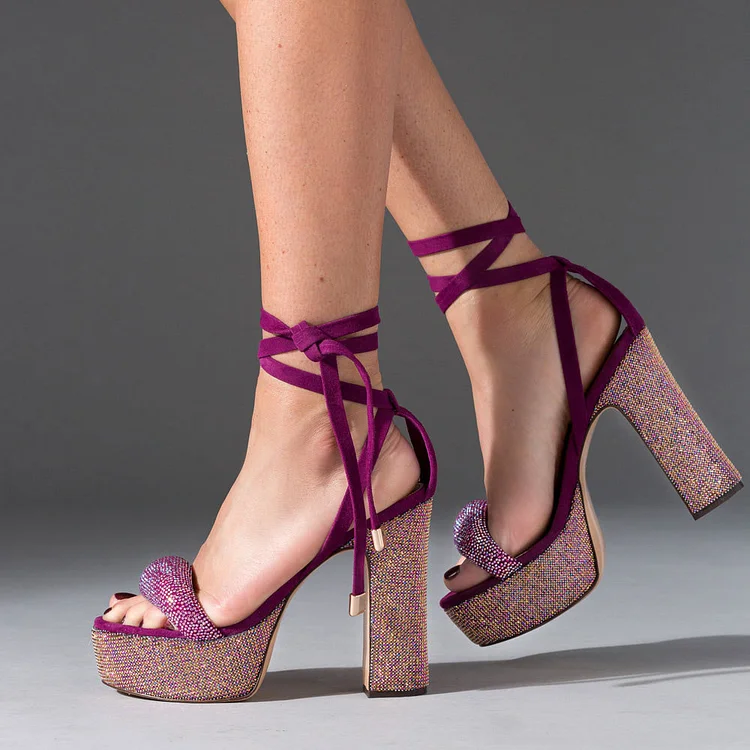 Elevate your style with these stunning Purple Open Toe Rhinestone Embellished Tie-Up Platform Heels. Featuring a vibrant purple hue, rhinestone detailing, and a tie-up design, these heels are perfect for adding glamour to any outfit.