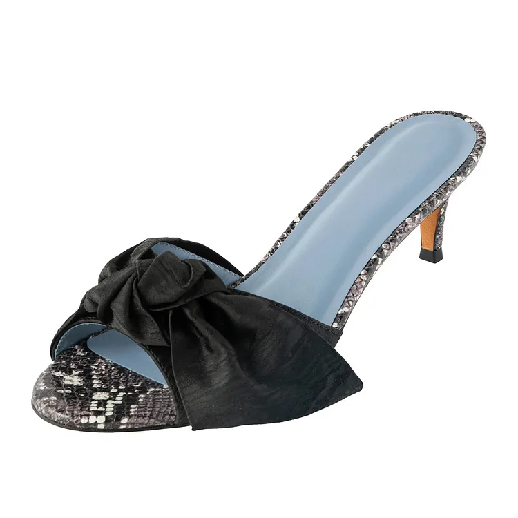 Black Snakeskin Embossed Open Round Toe Knot Accent Mule Heels