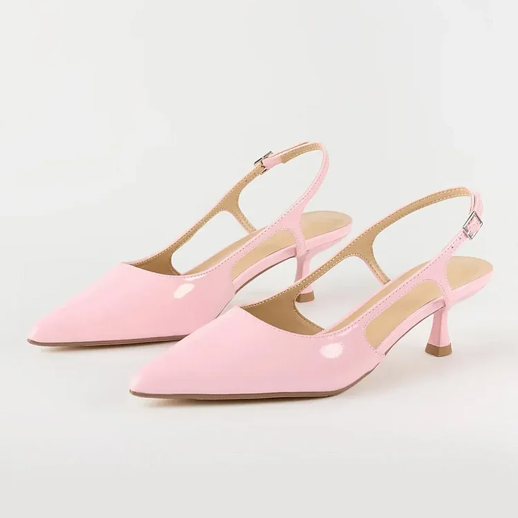 Elevate your style with these Chic Pink Patent Leather Pointed Toe Buckled Slingback Heels. The perfect blend of sophistication and flair, ideal for adding a touch of elegance to any outfit.