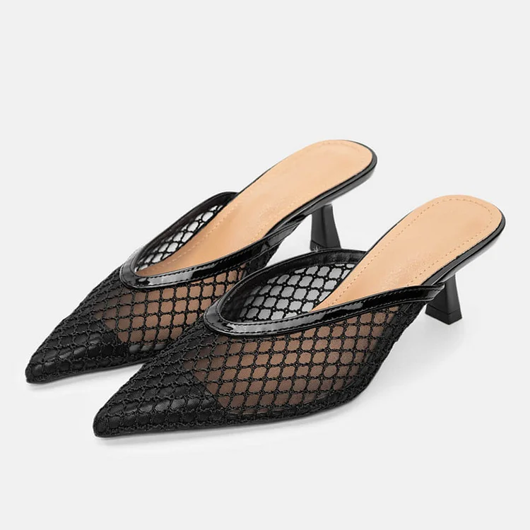 FSJ Simple Black Mesh Pointed Toe Slip-On Mule Kitten Heels