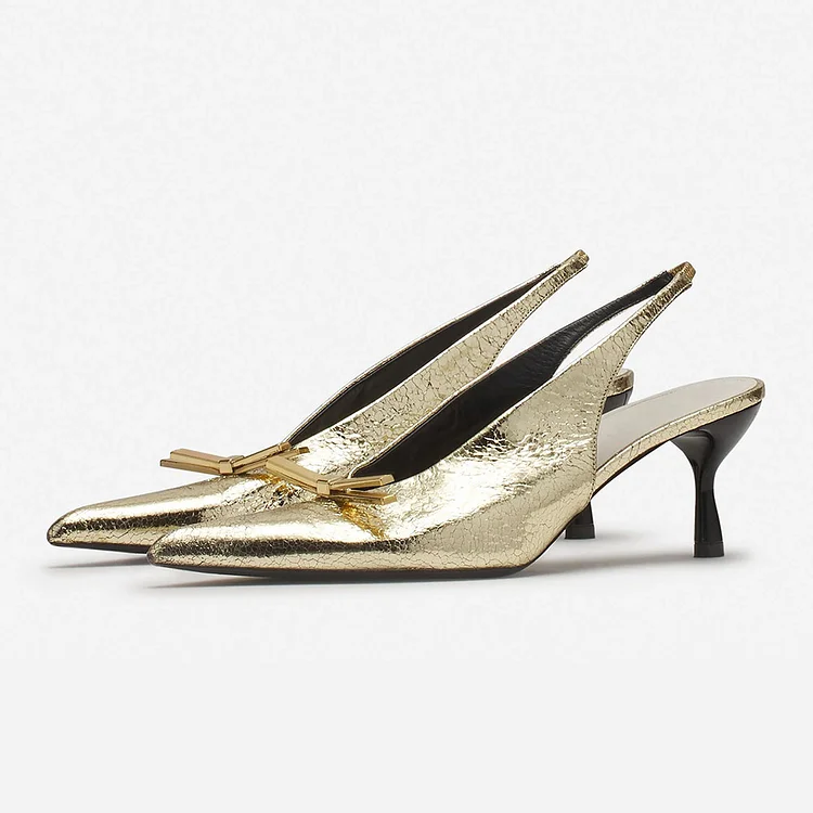 Elevate your style with these elegant Gold Crackled Metallic Finish Slingback Heels. Featuring a pointed toe and charming bow detail, these heels add a touch of sophistication to any ensemble.
