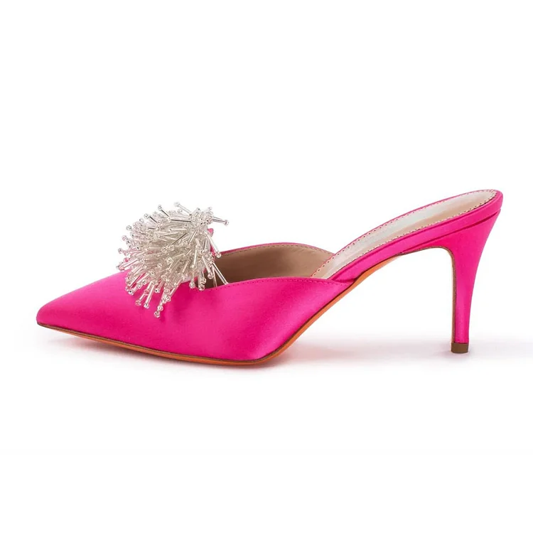 Hot Pink Kitten Heel Slip-On Mules Shoes with Beaded Tassel
