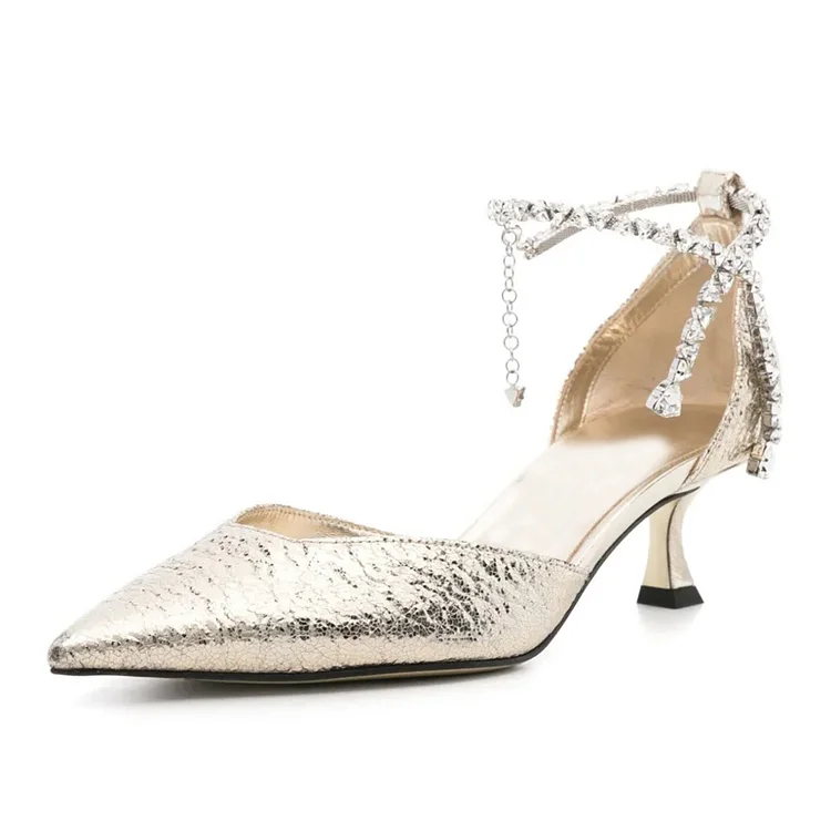 Elegant and glamorous, these Pale Gold Crackle Finish Rhinestone Ankle Strap Kitten Heel Pumps add a touch of sophistication. Perfect for special occasions with their sparkling detail and chic design.