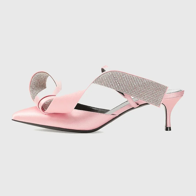 Elevate your style with our Satin Rhinestone Kitten Heel Spiral Bow Mules in Pink. These chic mules feature a delicate bow, sparkling rhinestones, and a comfortable kitten heel.
