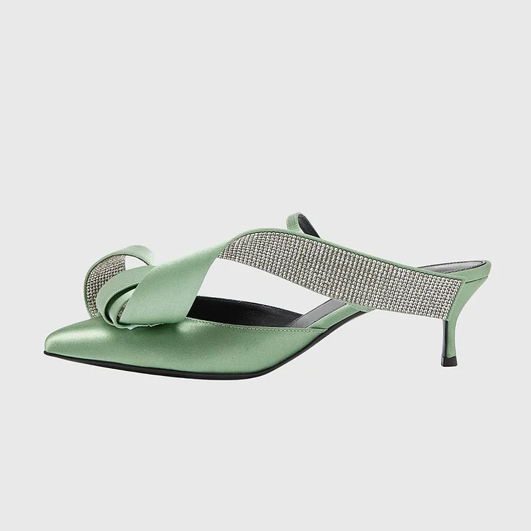 Stylish Light Green Rhinestone Pointed Toe Spiral Bow Mule Heels