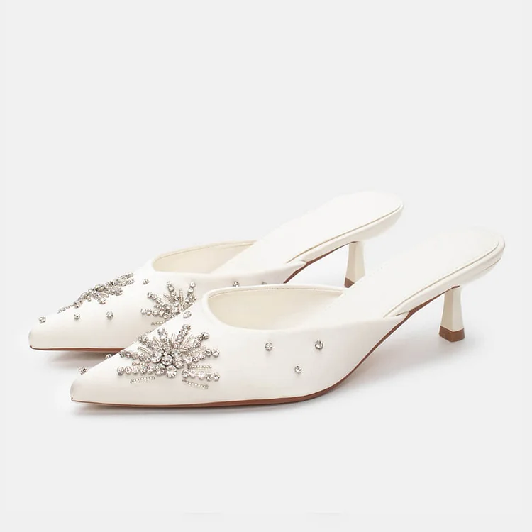White Satin Pointed Toe Rhinestone Kitten Heel Mules for Women