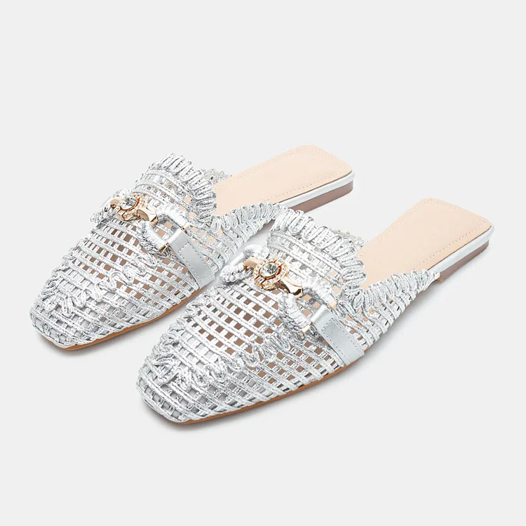 Elevate your style with our Silver Square Toe Rhinestone Horsebit Hollow Out Flat Mule Loafers. Featuring dazzling rhinestones and a unique design, these loafers effortlessly blend glamour with sophistication.