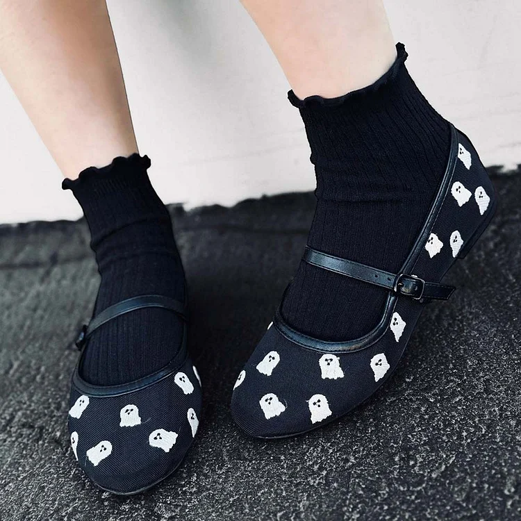 Step out in haunting style with our Black and White Ghost Embroidered Mesh Mary Jane Flats. Featuring a round toe, buckle strap, and playful ghost embroidery, these flats offer spooky charm with every step.