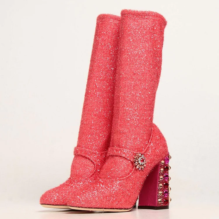 Elevate your style with these Pink Rhinestone Block Heel Mary Jane Sock Mid Calf Boots. Trendy and glamorous, featuring dazzling rhinestones and a stylish block heel for a fashion-forward statement.