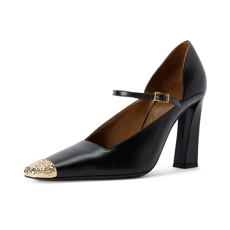 Step up in style with our Black Metal Cap Toe Mary Jane Pumps. Featuring a chic buckle strap, block heel, and metal cap toe, these shoes blend sophistication with edge effortlessly.