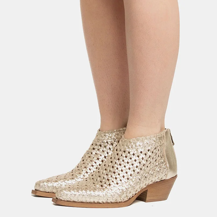 Gold Cutout Detail Pointed Toe Woven Short Booties with Zipper