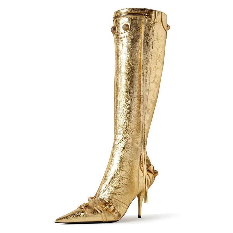 Step into luxury with our Gold Metallic Pointed Toe Studded Zipper Knee High Heeled Boots. Elevate any outfit with these stunning, edgy boots that effortlessly blend style and sophistication.