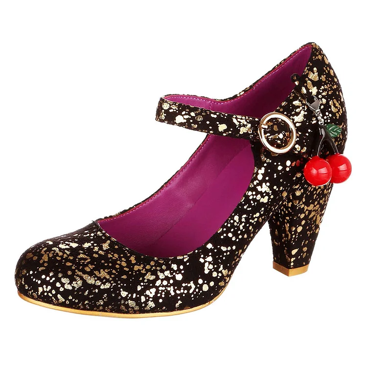 Black and Gold Buckle Strap Cone Heel Cherry Decor Mary Jane Pumps
