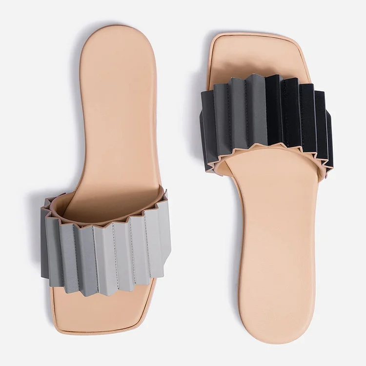 Black and Gray Open Square Toe Pleated Detail Slides for Women