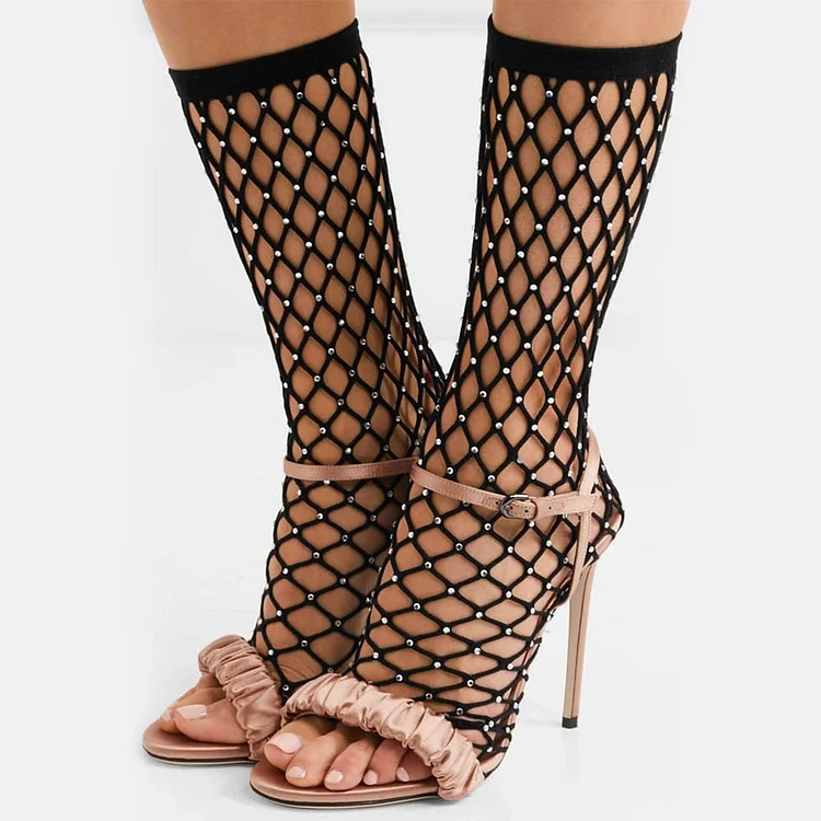 Elevate your style with our Black and Pink Fishnet Rhinestone Stiletto Heel Pleated Sock Boots. These statement boots blend sophistication with a touch of edgy glamour, perfect for bold fashionistas.