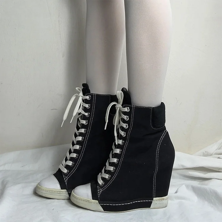 Step into style with these Black and White Wedge Heel Tie-Up Round Toe Sneaker Short Booties. Featuring a chic design, comfortable wedge heel, and trendy tie-up closure, perfect for fashion-forward casual looks.