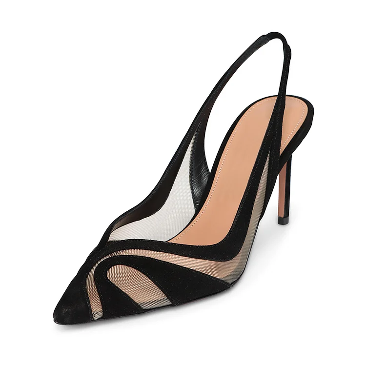 Elevate your style with these elegant Black Mesh Patchwork Pointed Toe Stiletto Heel Slingback Pumps. The intricate design and sleek silhouette make them a must-have for any fashion-forward wardrobe.