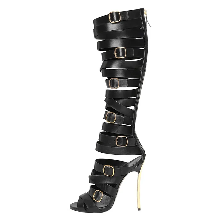 Black Peep Toe Buckled Strappy Chunky Heel Zip Gladiator Sandals