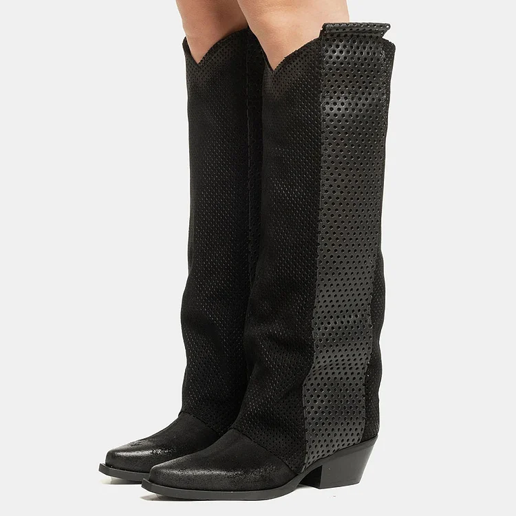 Step into style with these Black Perforated Chunky Heel Western Boots for Women. Featuring a knee-high design, a trendy perforated pattern, and a chunky heel, this pair adds flair to any outfit effortlessly.