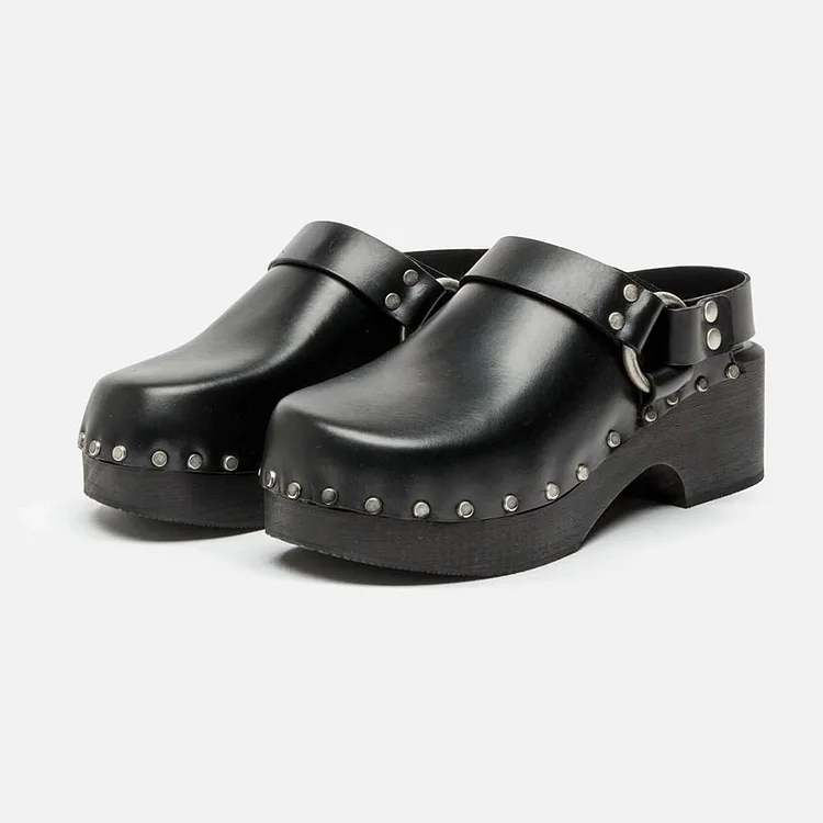Black Studded Round Toe Metal Ring Strap Slingback Clogs Shoes
