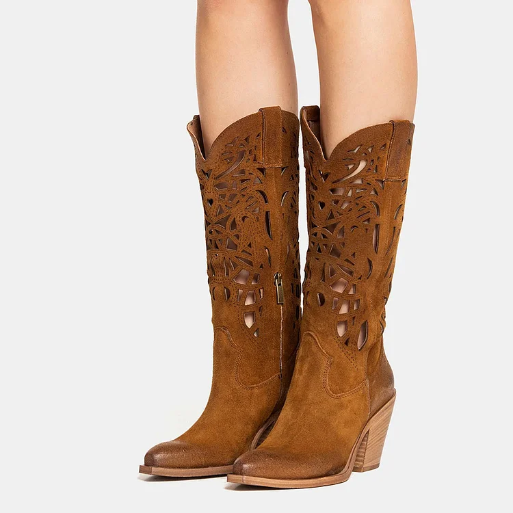 Step into style with these Brown Hollow Out Chunky Heel Mid Calf Cowboy Boots for Women, featuring a trendy hollow out design and chunky heel for a perfect blend of fashion and comfort.