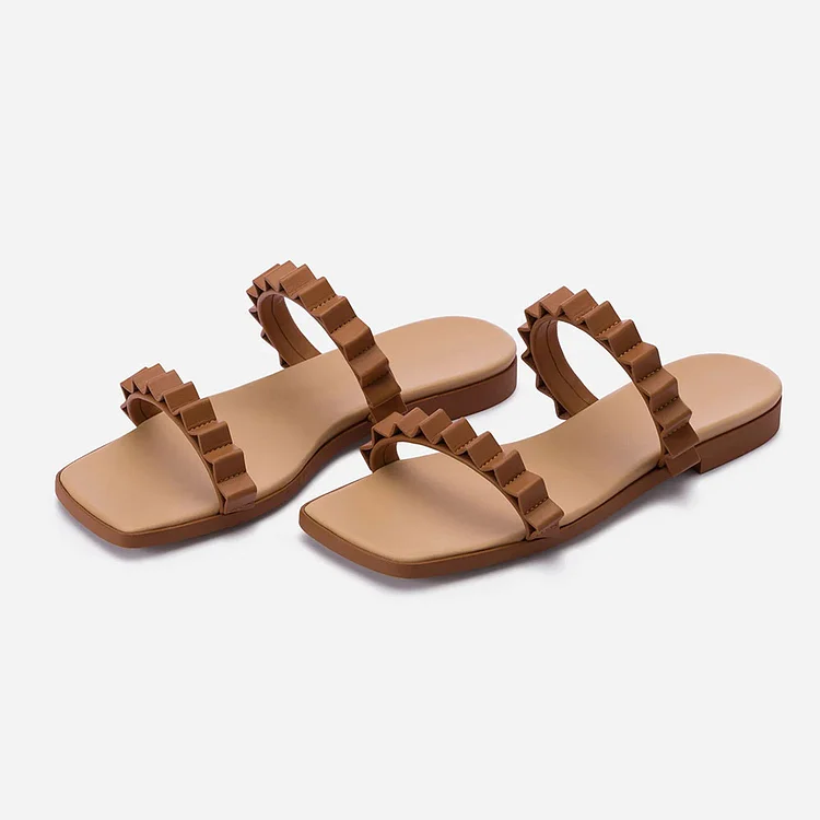 Brown Open Square Toe Flat Slide Sandals with Pleated Straps