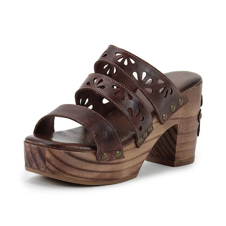 Brown Stud Open Toe Floral Cutout Chunky Heel Platform Sandals