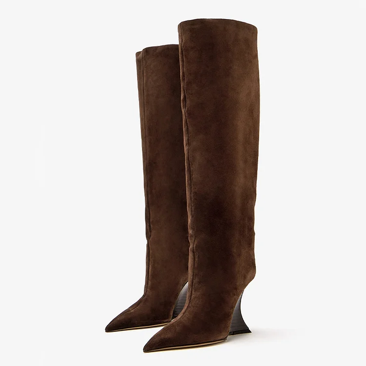 Step out in style with these Brown Lizard Print Wedge Heel Pointed Toe Knee High Boots. Featuring a chic lizard print design, pointed toe, and comfortable wedge heel for a fashionable statement.