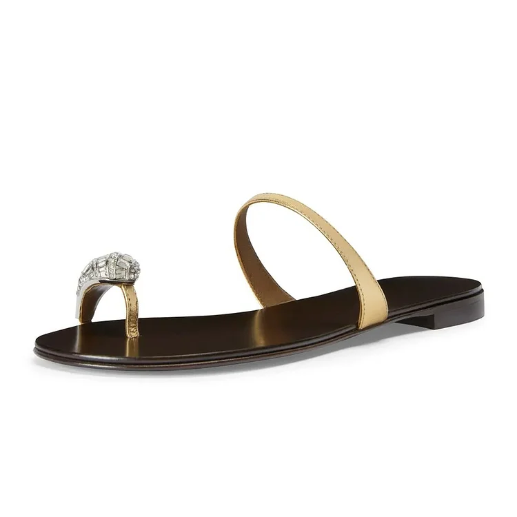 Chic Gold Open Round Toe Crystal Decor Flat Mules for Women