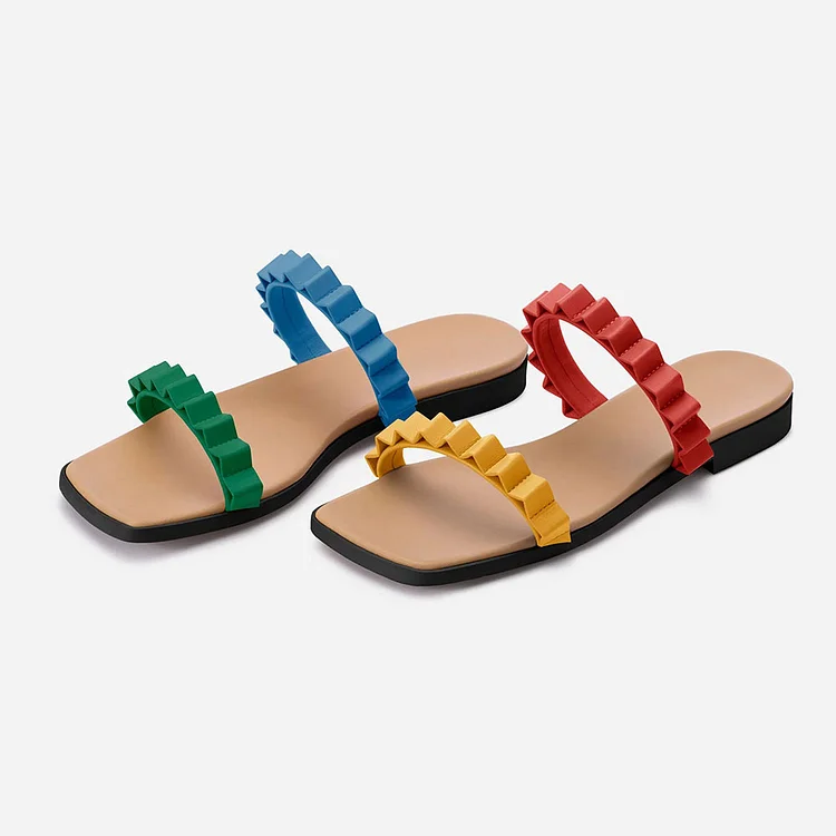 Step into style with our Colorful Open-Toe Flat Slip-On Sandals. Featuring pleated straps, these trendy sandals offer a blend of comfort and chic design for the modern woman on the move.