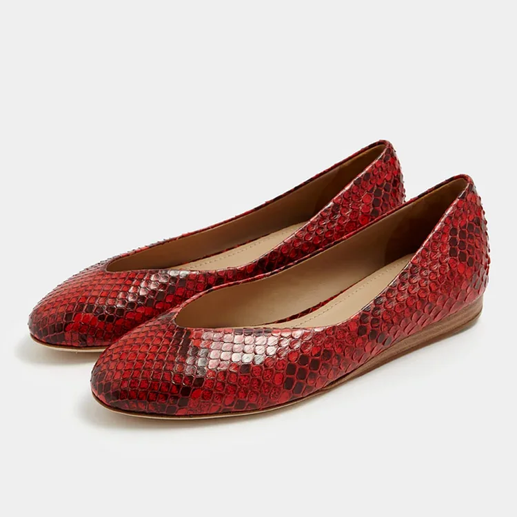 Step out in style with these sophisticated red and black python-embossed dress flats. Featuring a round toe design, these comfortable shoes are perfect for completing your chic ensemble with flair.