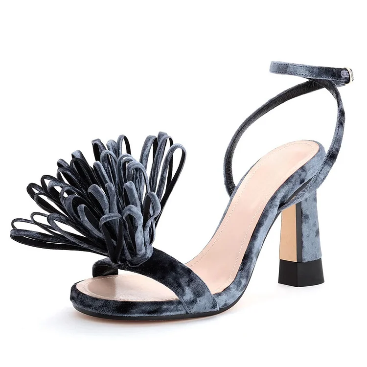 Step into elegance with these Dark Gray Velvet Flower Open Toe Ankle Strap Heeled Sandals. Featuring a plush velvet finish, delicate floral embellishments, and a secure ankle strap, this exudes sophistication with every stride.