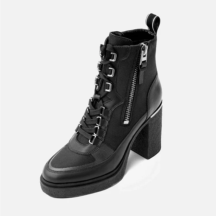 Elevate your style with these FSJ's Black Block Heel Zipper Platform Lace-Up Booties. Featuring a bold design, sturdy block heel, convenient zipper closure, and trendy lace-up detailing, perfect for fashion-forward women.