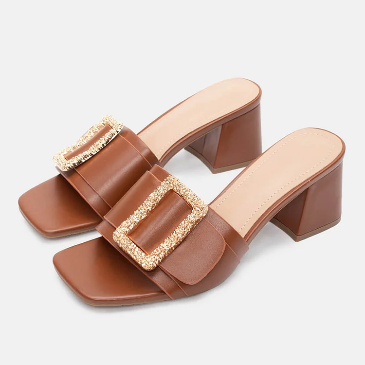 Elevate your style with FSJ's Brown Heeled Mules. Featuring an open square toe, accented with a striking gold buckle, these shoes blend sophistication and trend effortlessly. Ideal for chic ensembles.