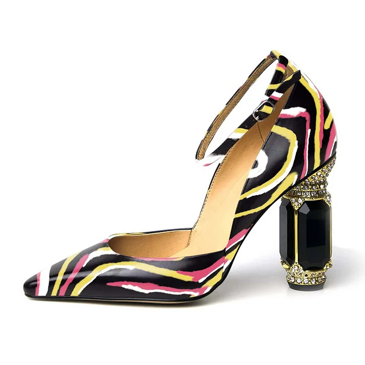 Elevate your style with these striking Multicolor Stripes Rhinestone Pointed Toe Heels. Featuring a vibrant stripe pattern, ankle strap, and dazzling rhinestones, these heels add glamour and flair to any outfit.