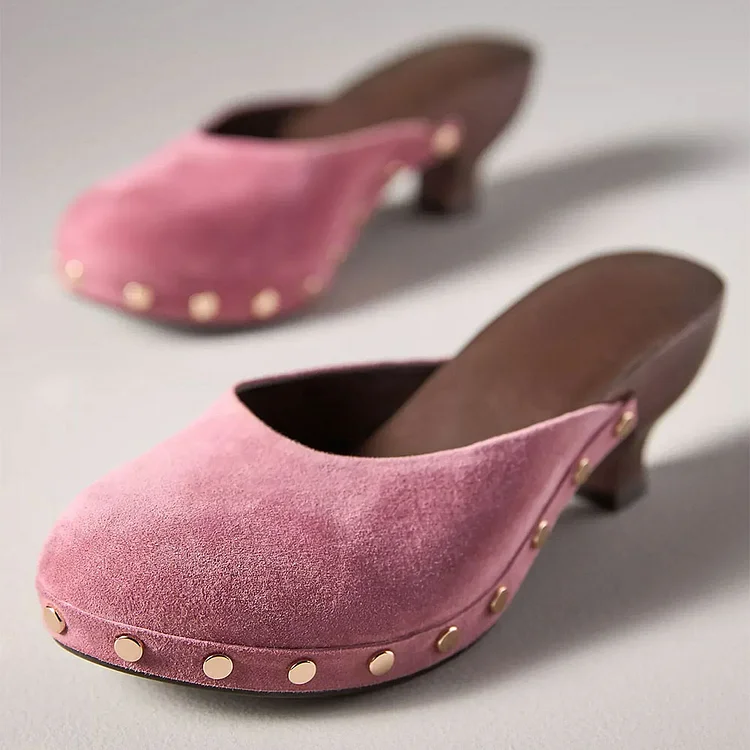 Elevate your style with these Pink Round Toe Slip-On Mule Heels. Featuring stud embellishments on vegan suede, these chic shoes blend comfort and glamour seamlessly for a trendy statement look.