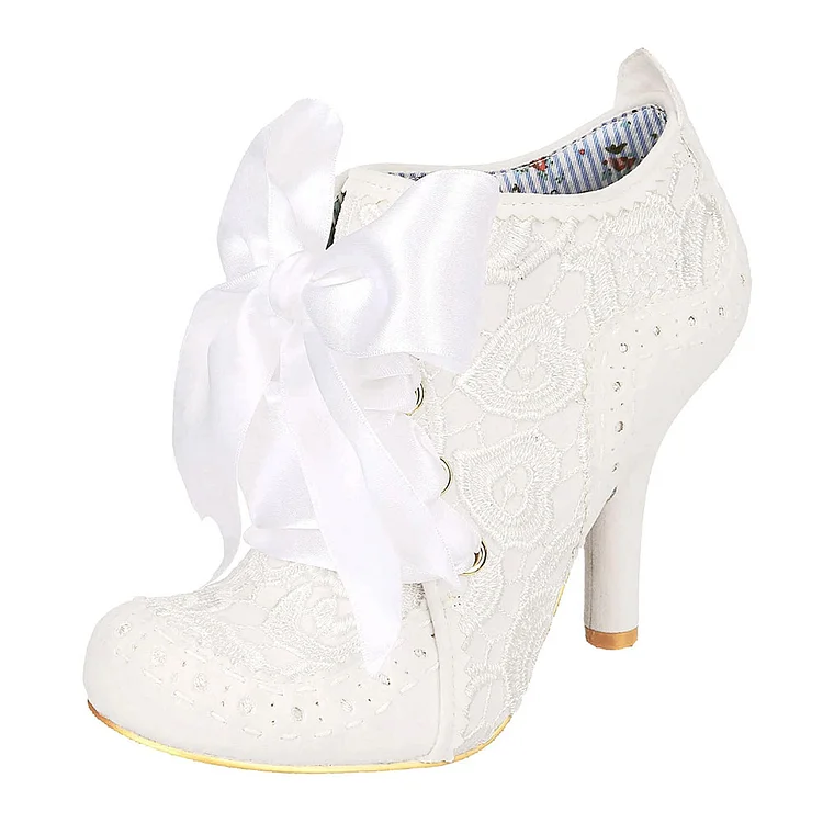Step back in time with these retro white lace stiletto heel ankle boots. Featuring ribbon ties and a platform design, they exude vintage elegance, perfect for a stylish wedding ensemble.