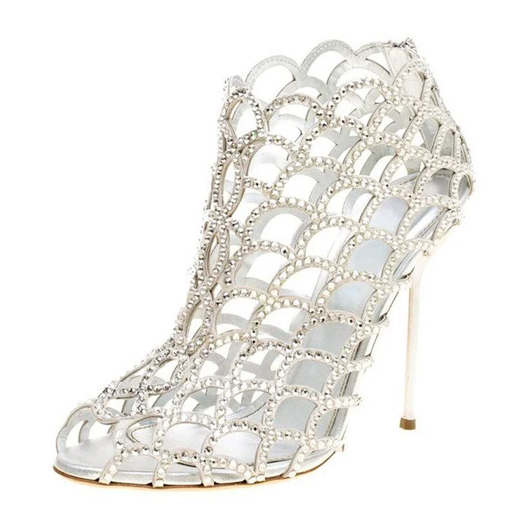 Silver Rhinestone Cutout Stiletto Heel Zipper Peep Toe Booties