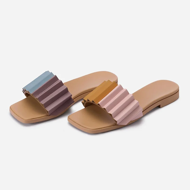 Introducing our chic "Simple Open Square Toe Pleated Slip-On Sandals in Multicolor". Elevate your style with these colorful pleat-accented sandals, offering comfort and trendy flair for every step you take.