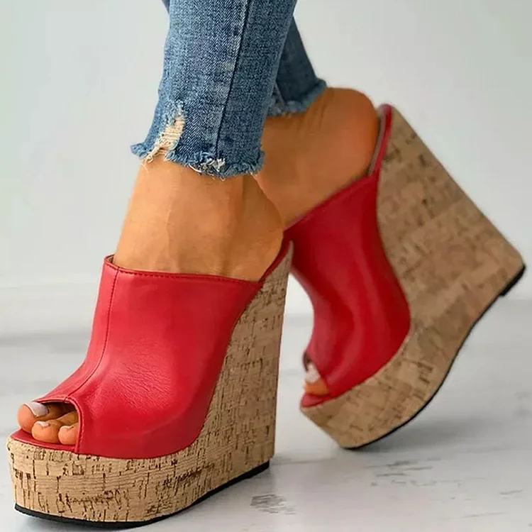 Simple Red Peep Toe Slip-On Wedge Heel Platform Slide Sandals