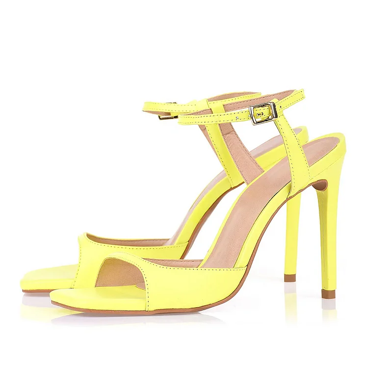 Elevate your style with these chic yellow stiletto heel sandals. Featuring a simple yet elegant design with an open square toe and ankle strap, perfect for adding sophistication to any outfit.