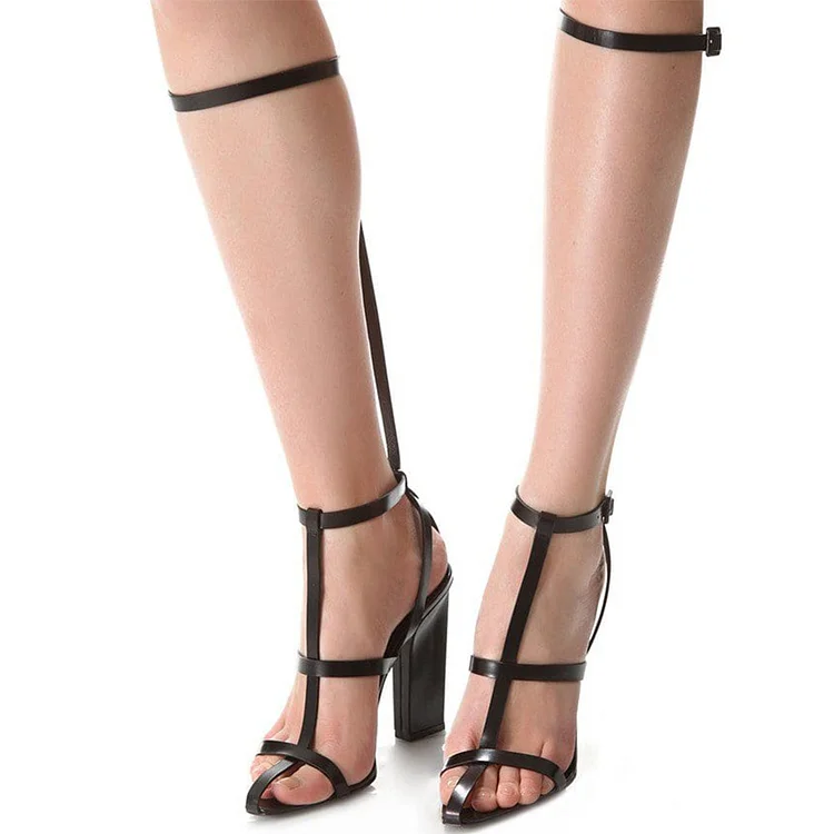 Elevate your style with these chic black knee-high gladiator heels. Featuring an open-toe design and buckle strap detailing, these heels are the perfect statement footwear for any occasion.