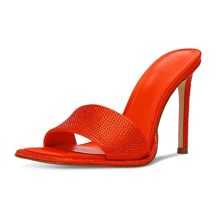Elevate your look with these stunning Orange Open-Toe Allover Rhinestone Stiletto Heel Slide Shoes. Bold and glamorous, perfect for adding a touch of sparkle to any outfit.