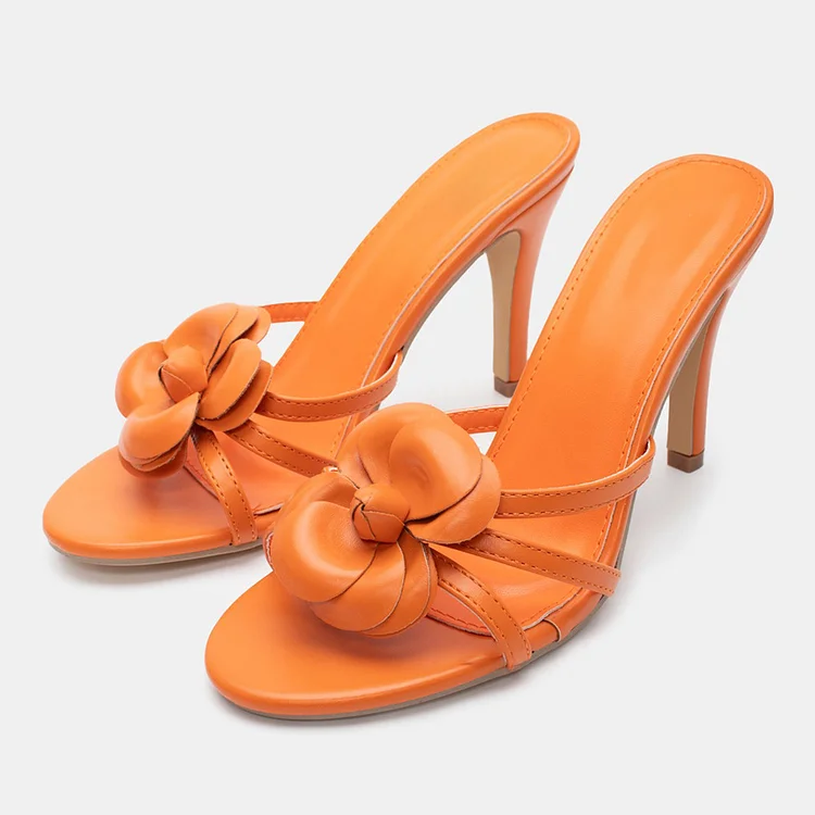Stiletto Heel Flower Decor Open Toe Mules for Women in Orange