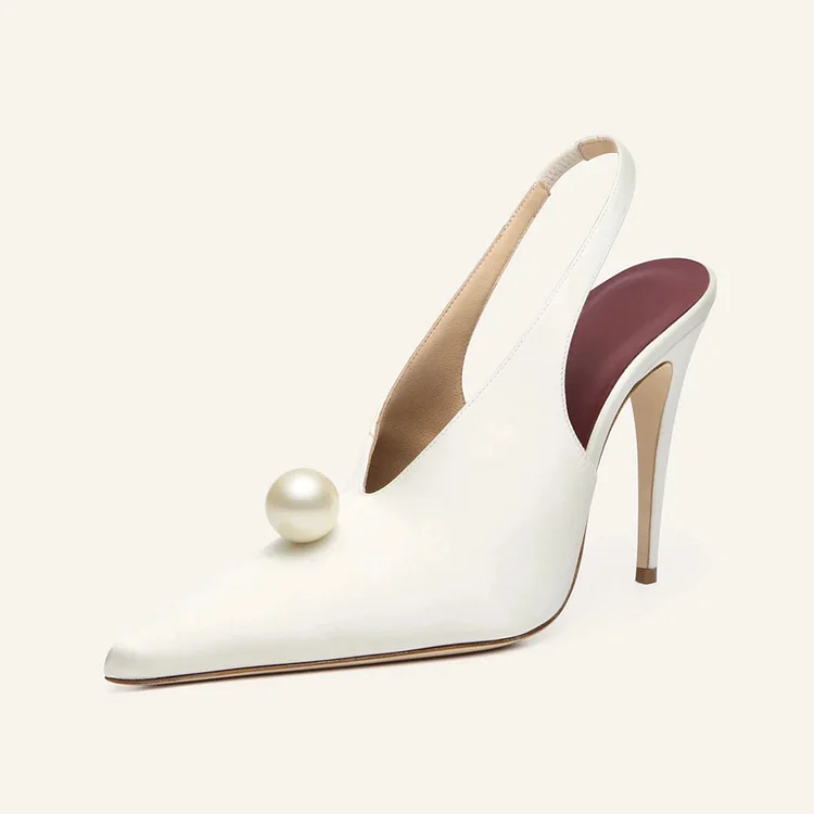Classy Ivory Satin Pointed Toe Pearl Decor Slingback Pumps Heels